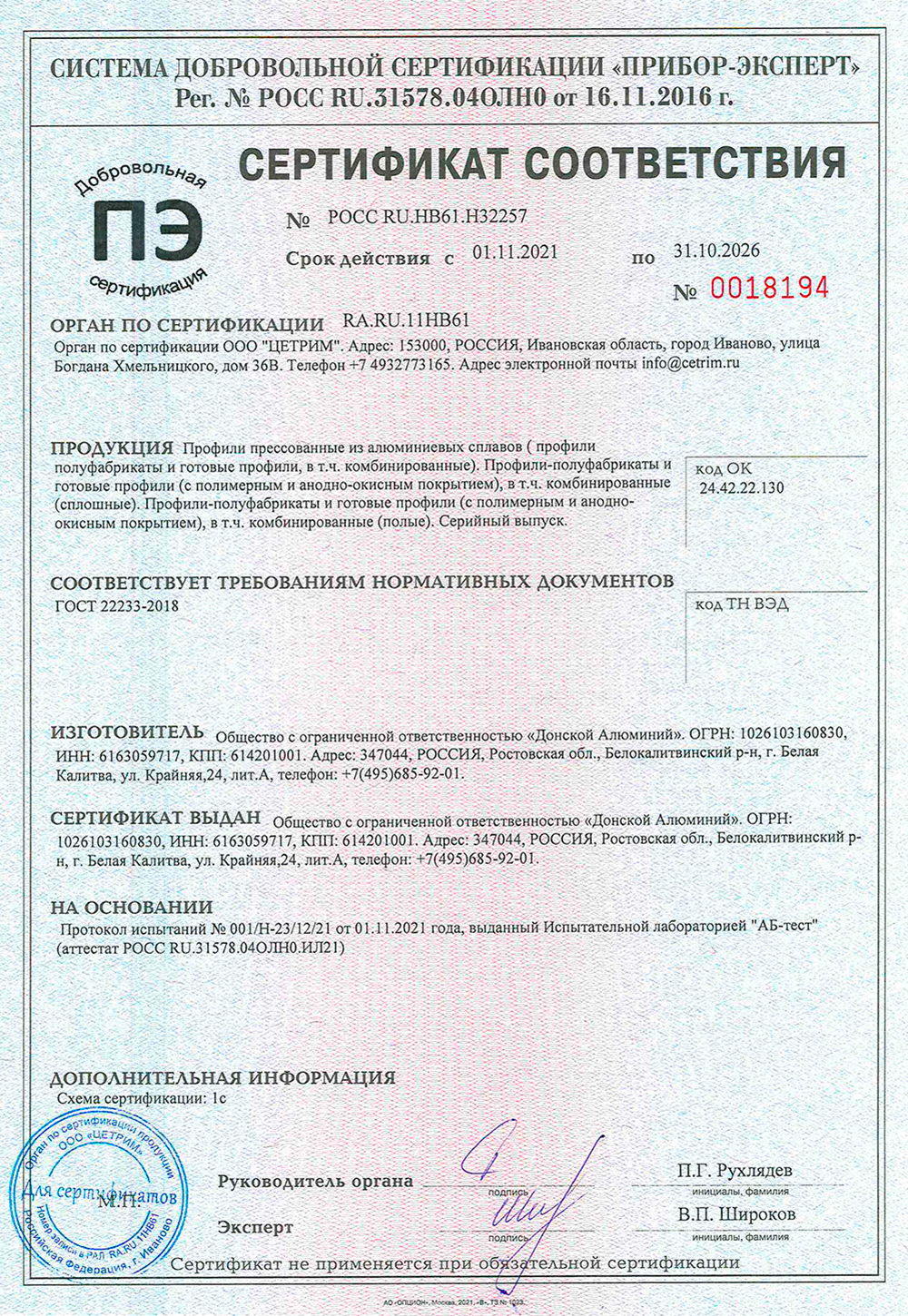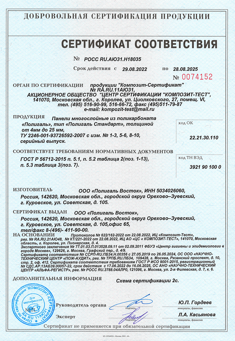 Теплицы и каркасы теплиц не входят в единый перечень продукции, подлежащей обязательной сертификации и единый перечень продукции, подтверждение соответствия которой осуществляется в форме принятия декларации о соответствии. Таким образом, для теплиц GLASS HOUSE обязательная сертификация не требуется. Ниже представлены сертификаты на материалы и комплектующие, которые используются в производстве наших теплиц.